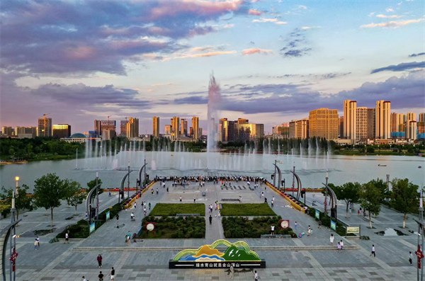 落霞與噴泉齊飛的蘭州新區(qū)棲霞湖景觀
