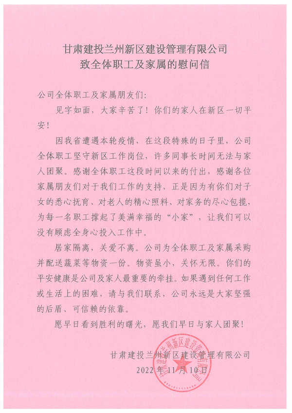 公司還收到了一封來自員工家屬的感謝信,信的主人是白阿姨,今年八十多歲,是甘肅建投的一名老黨員、老職工。簡單樸實(shí)的文字卻流露著員工家屬最真摯的感情,給全體員工帶來了無窮的力量,堅(jiān)定了勇往直前的信心。