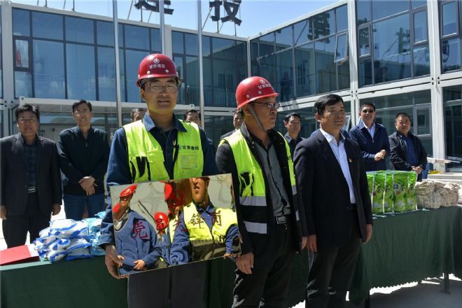 慰問中,馬建峽代表新區(qū)公司黨委,為項目部優(yōu)秀黨員代表授予了“黨員先鋒崗”榮譽稱號獎牌,馬建峽、嚴(yán)永紅、何謀?,F(xiàn)場為溫鴻武、張志喜、韋建旺三名優(yōu)秀黨員佩戴了黨徽。馬建峽在講話中,對項目部所取得的成績給予肯定,對各位職工的辛勤付出表示感謝。他說,項目部廣大黨員干部職工克服高原反應(yīng)和風(fēng)雨驟至極端天氣,以艱難困苦、玉汝于成的堅定信念直面困難、勇挑重?fù)?dān),有序推進(jìn)項目施工進(jìn)度,充分展示了甘肅建投良好的企業(yè)形象和廣大員工的精神風(fēng)貌,黨委及鋼結(jié)構(gòu)公司將一如既往給予大力支持,配合搞好服務(wù),為項目建設(shè)創(chuàng)建良好施工環(huán)境。他叮囑職工在工作時務(wù)必確保身體健康和施工安全,做到文明施工、安全施工、和諧施工。同時,希望項目部在保證工程質(zhì)量的前提下,克服各種困難,迎難而上,確保項目快速推進(jìn),爭取項目早日建成。隨后,參與慰問的領(lǐng)導(dǎo)現(xiàn)場為職工代表發(fā)放了慰問品。