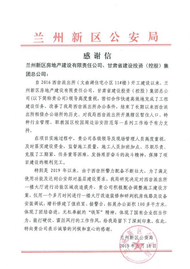 近日,甘肅建投新區(qū)公司收到一封來自蘭州新區(qū)公安局的感謝信。信中對甘肅建投在蘭州新區(qū)文曲湖住宅小區(qū)11#樓和西岔派出所一樓大廳的功能區(qū)域升級改造工程順利完成施工建設(shè)任務(wù)表示感謝。這兩個項目均由新區(qū)公司具體負責(zé)管理運營,這不僅是對新區(qū)公司在蘭州新區(qū)文曲湖項目中優(yōu)異成績的肯定,更是對甘肅建投品質(zhì)施工的最好見證。