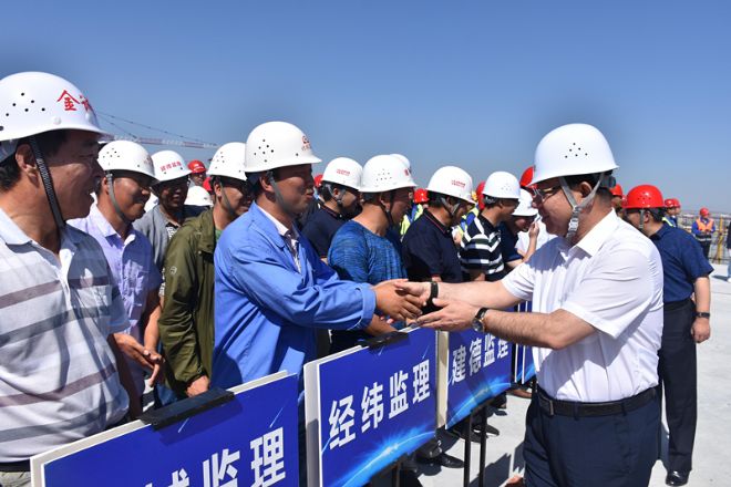 甘肅建投黨委書(shū)記、董事長(zhǎng)蘇躍華與參建職工代表親切握手