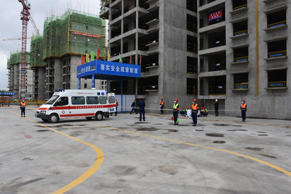 本次演練分為“人員墜樓”、“觸電事故”、“火災(zāi)事故”三個(gè)科目。演練模擬施工作業(yè)人員不慎墜樓、現(xiàn)場(chǎng)施工作業(yè)人員意外觸電、施工現(xiàn)場(chǎng)出現(xiàn)火災(zāi)等項(xiàng)目施工現(xiàn)場(chǎng)常見(jiàn)的生產(chǎn)安全事故。隨著施工現(xiàn)場(chǎng)“快來(lái)人呀、救人呀”的呼救聲,項(xiàng)目部立即啟動(dòng)應(yīng)急救援預(yù)案,應(yīng)急救援各組迅速抵達(dá)現(xiàn)場(chǎng),疏散組、搶救組、后勤組、救護(hù)組、調(diào)度組等迅速投入事故現(xiàn)場(chǎng),在事故面前臨危不亂,有序進(jìn)行現(xiàn)場(chǎng)警戒、安全疏散、扶持傷員撤離,整個(gè)救援演練過(guò)程緊張有序,貼近實(shí)際,場(chǎng)景逼真。