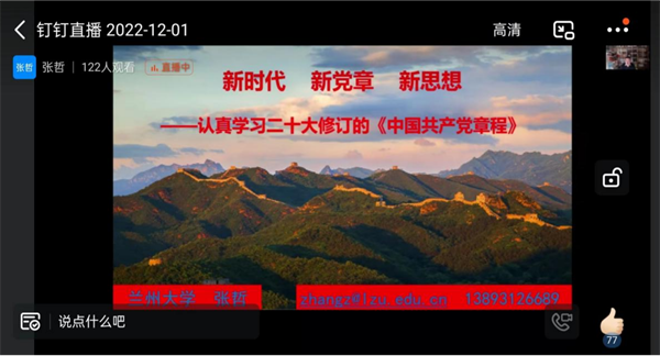 蔡文成教授以《深入學(xué)習(xí)貫徹黨的二十大精神》為題,從深刻認(rèn)識黨的二十大重大意義、深刻領(lǐng)會以中國式現(xiàn)代化推進中華民族偉大復(fù)興的根本任務(wù)、深刻領(lǐng)會以偉大自我革命引領(lǐng)偉大社會革命的重要要求、牢牢把握團結(jié)奮斗的時代要求等方面深入淺出地對黨的二十大精神進行了全面、系統(tǒng)的解讀。張哲教授以《新黨章新思想》為題,從過去中國非凡十年的發(fā)展、牢牢把握新時代中國特色社會主義思想的世界觀和方法論、全面從嚴(yán)治黨的重大意義等方面闡釋了新黨章中的新觀點、新思想。