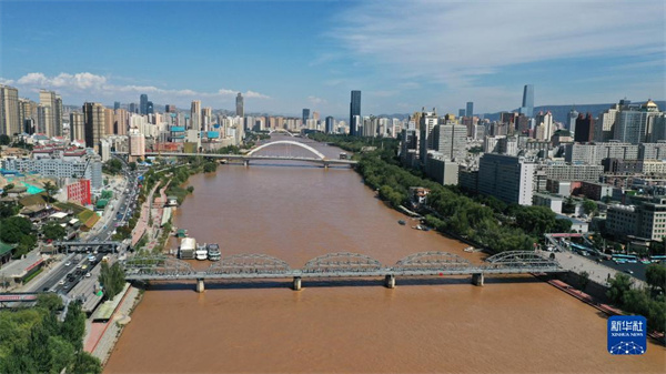 這是黃河蘭州段城市風光(2022年9月5日攝,無人機照片)。新華社記者 陳斌 攝