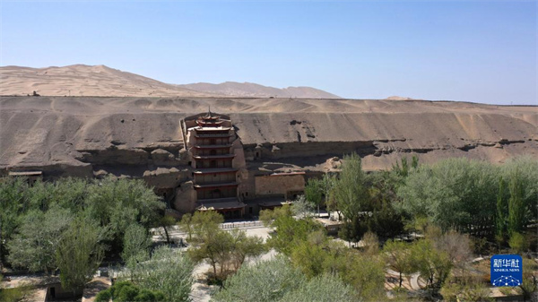 這是世界文化遺產莫高窟的標志性建筑——第96窟窟外木構建筑九層樓(2022年4月18日攝,無人機照片)。新華社記者 陳斌攝