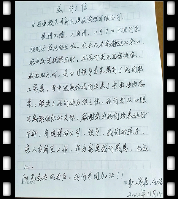 公司還收到了一封來自員工家屬的感謝信,信的主人是白阿姨,今年八十多歲,是甘肅建投的一名老黨員、老職工。簡單樸實(shí)的文字卻流露著員工家屬最真摯的感情,給全體員工帶來了無窮的力量,堅(jiān)定了勇往直前的信心。
