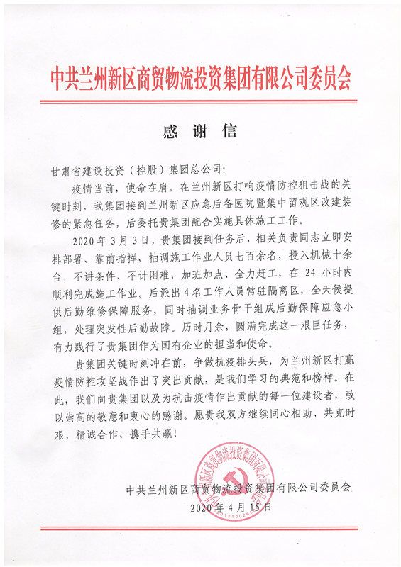 4月15日,一封字里行間滿懷真摯感謝的文件送到甘肅建投新區(qū)公司,文件中向甘肅建投的每一名建設(shè)者、維保者和工作人員致以崇高的敬意和衷心的感謝,這是全體人員無(wú)私付出贏得的嘉獎(jiǎng),這是共產(chǎn)黨員“守初心、擔(dān)使命”形成合力取得的成績(jī),這是甘肅建投沖在第一線“戰(zhàn)疫”樹起的榜樣。